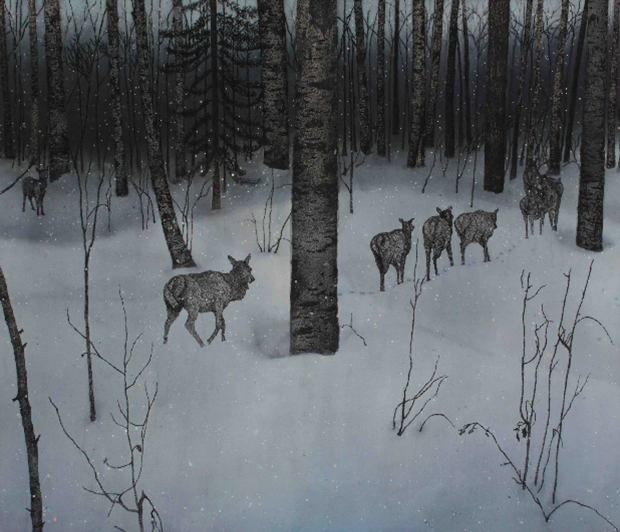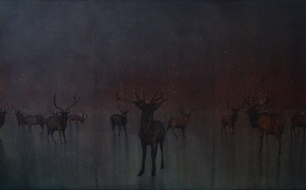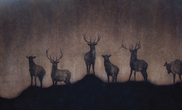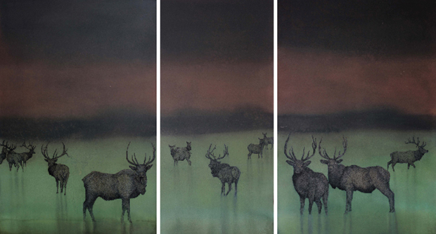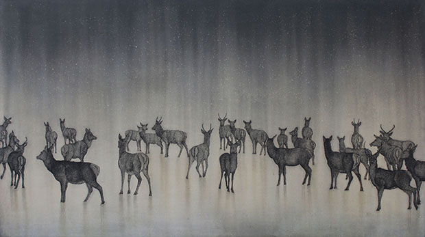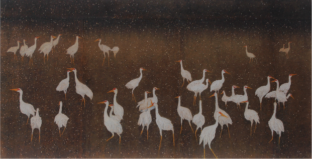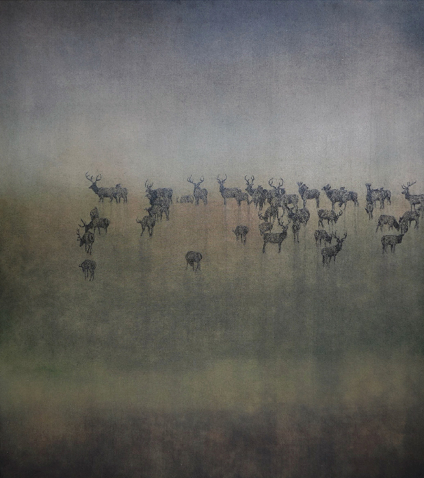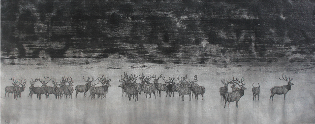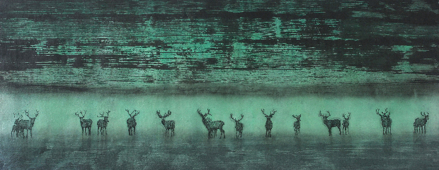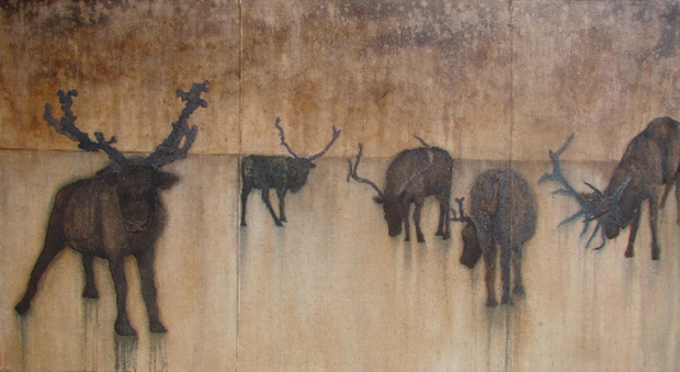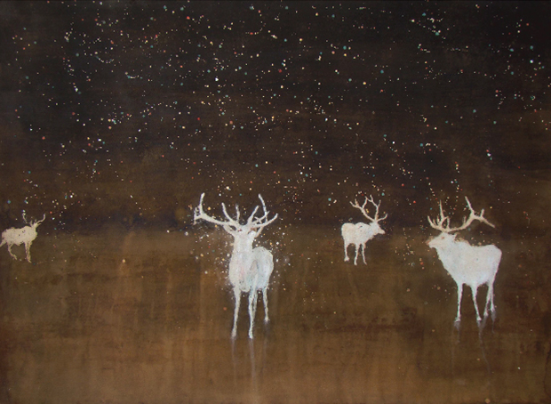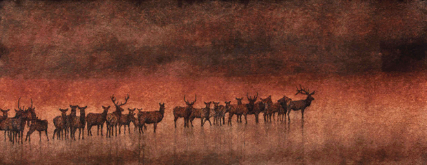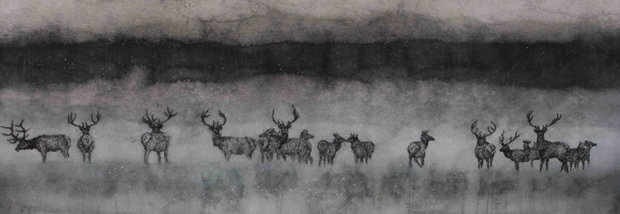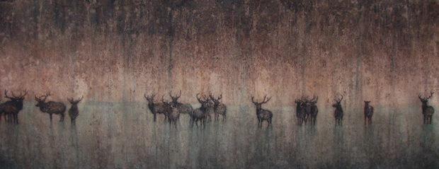 '“the gathering” acrylic, ink and silicon carbide on handmade cotton rag paper 78” x 32”'
