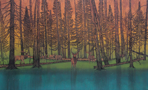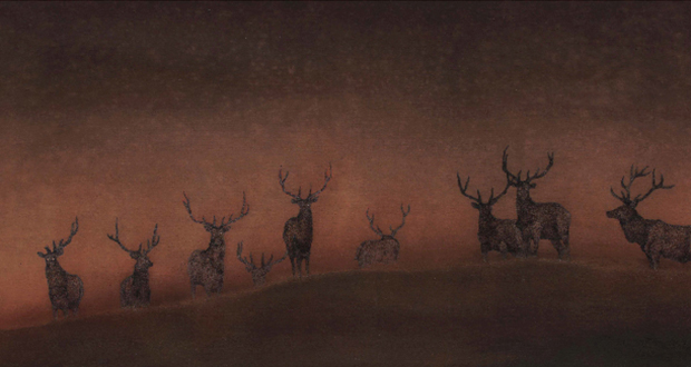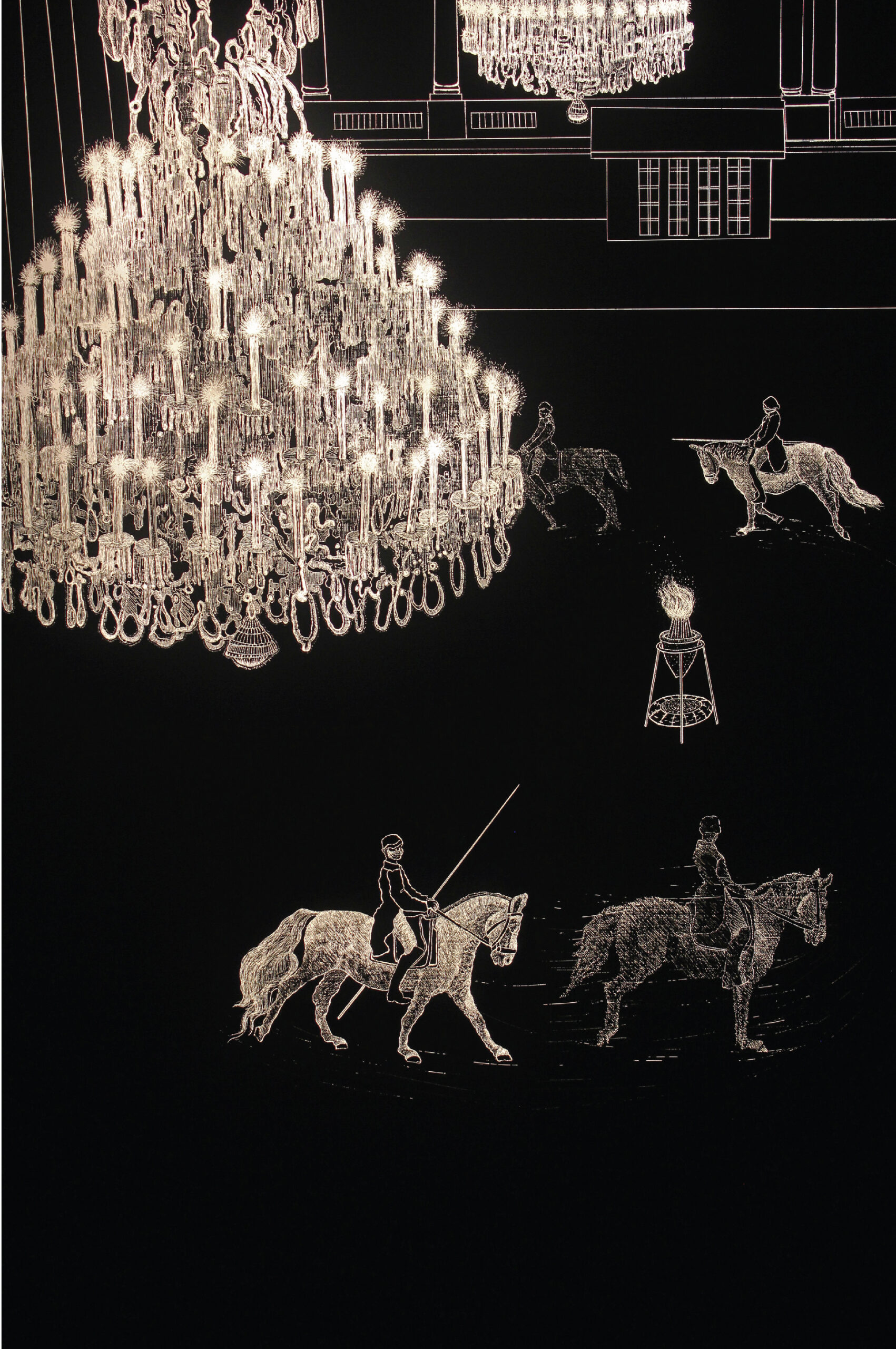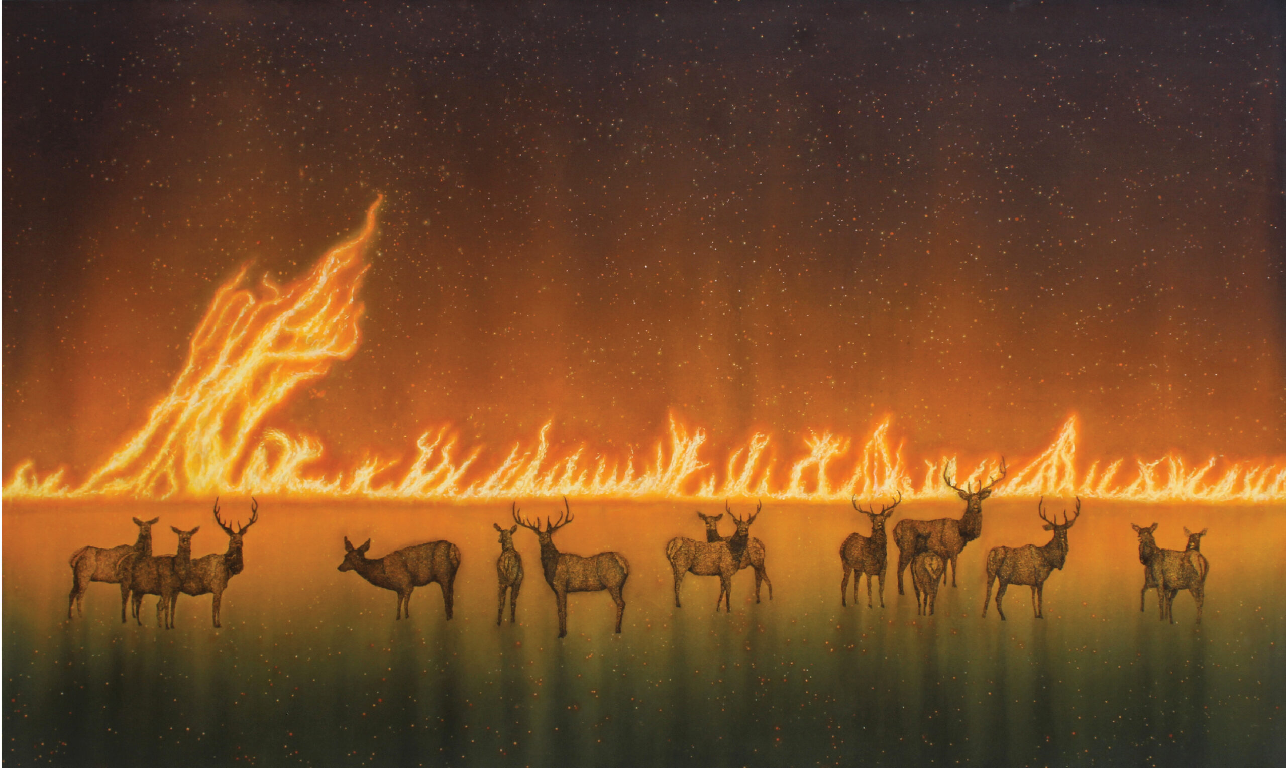 '“under this dying light” acrylic and engraving on plexiglass mounted on wooden lightbox with led fixtures 74” x 38”'