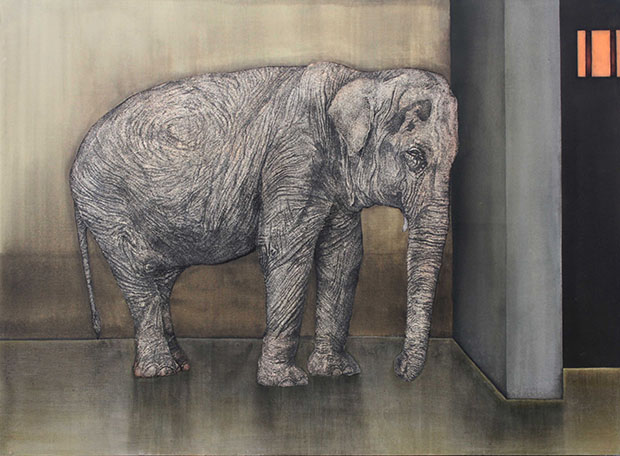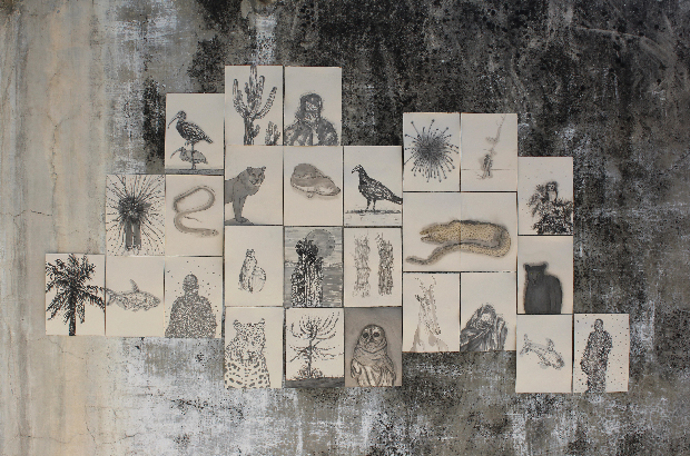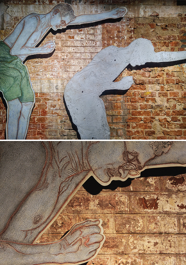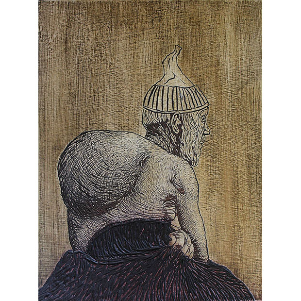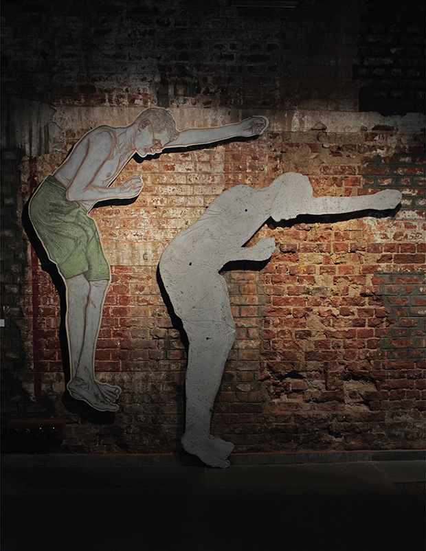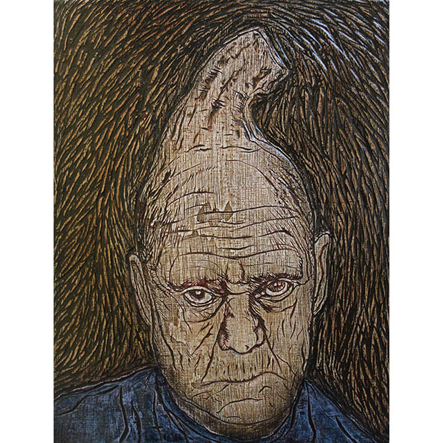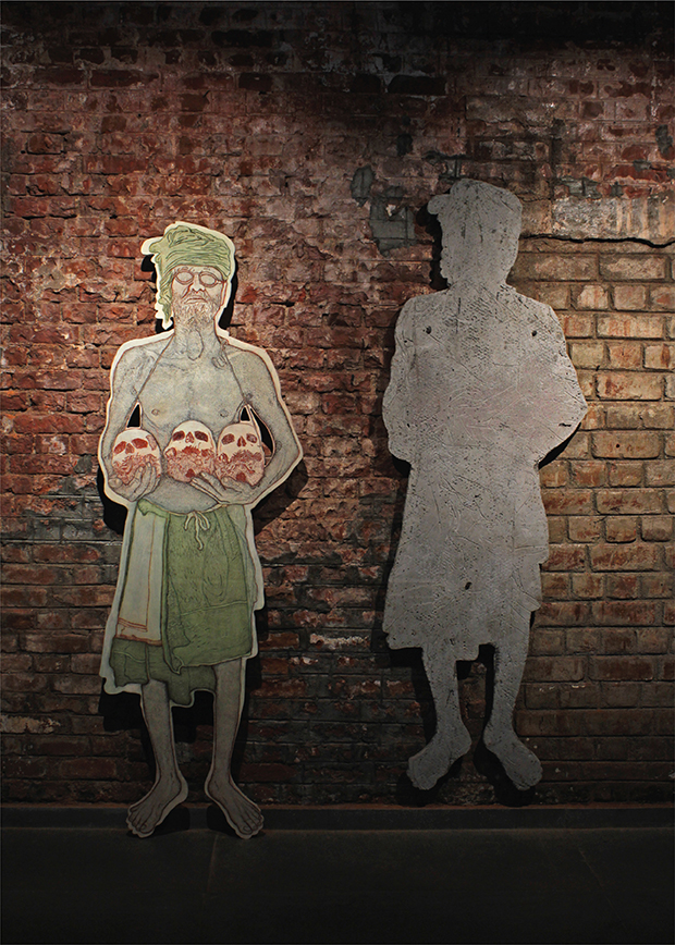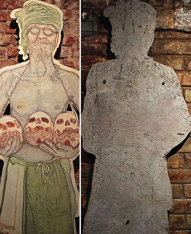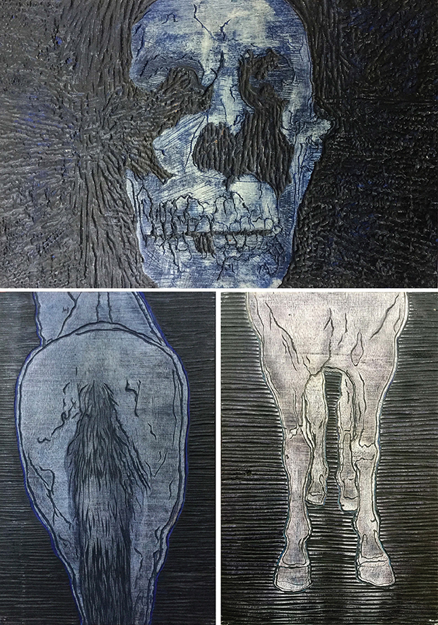 engraving, ink, acrylic, pigment, concrete, iron and wood