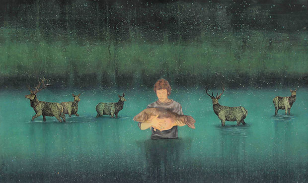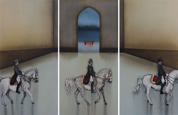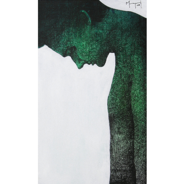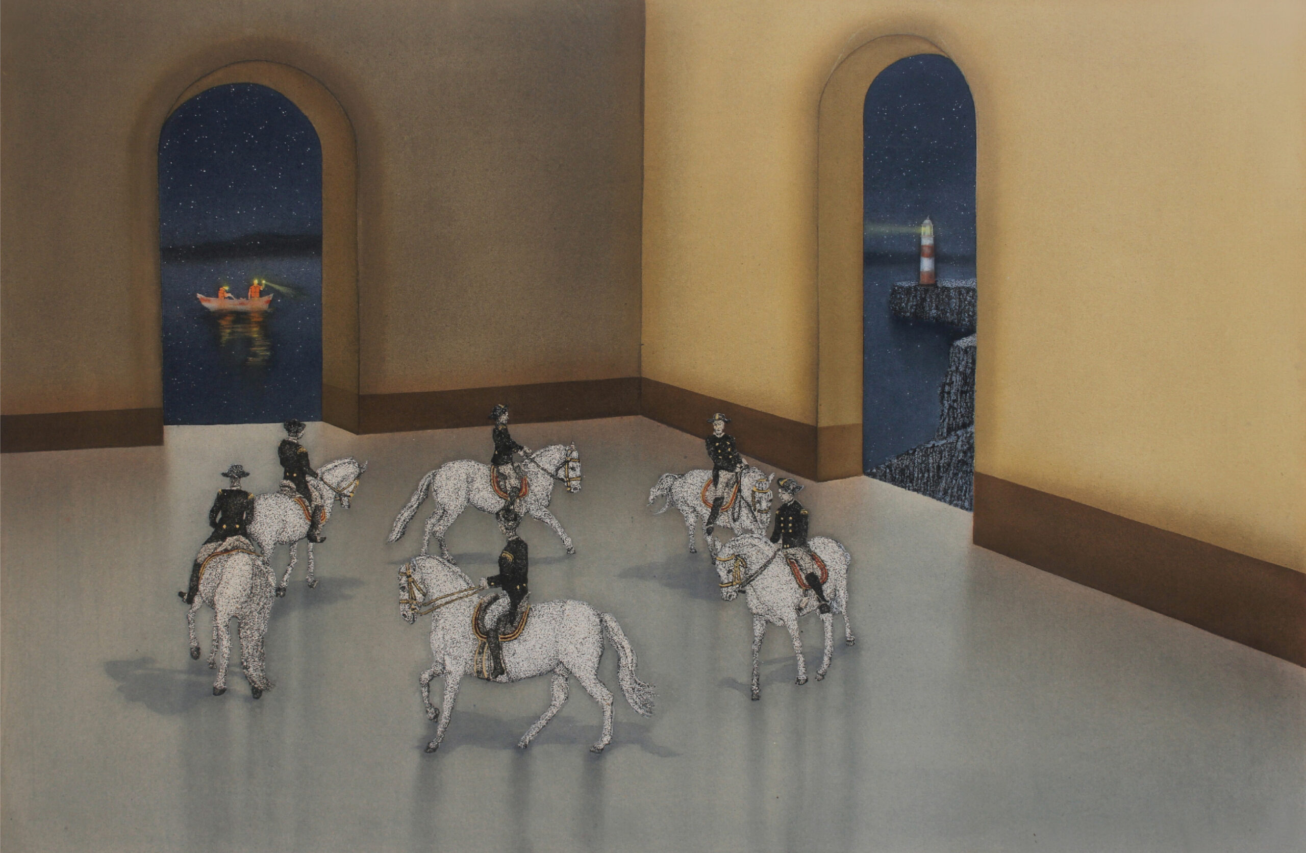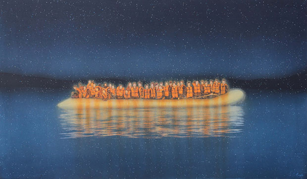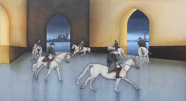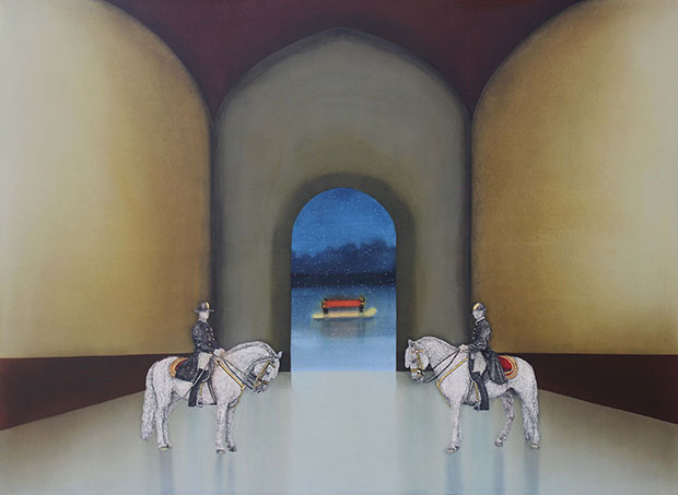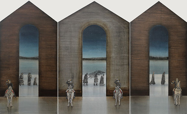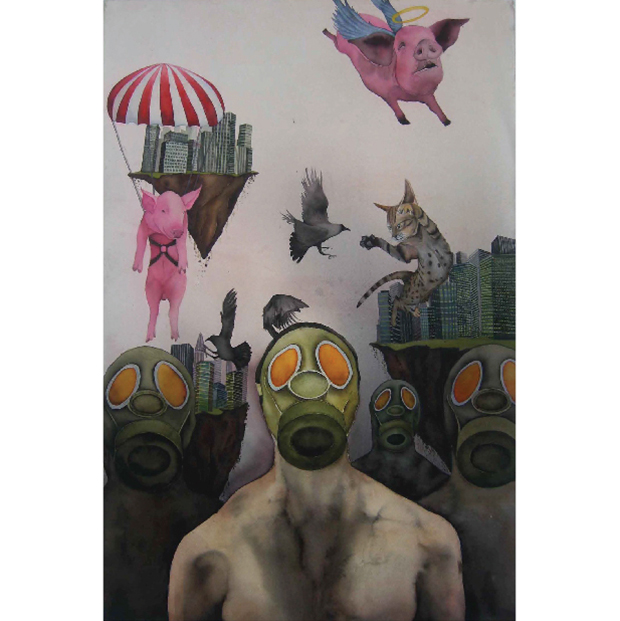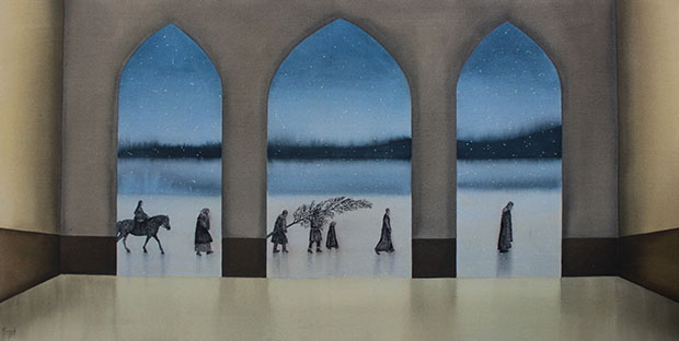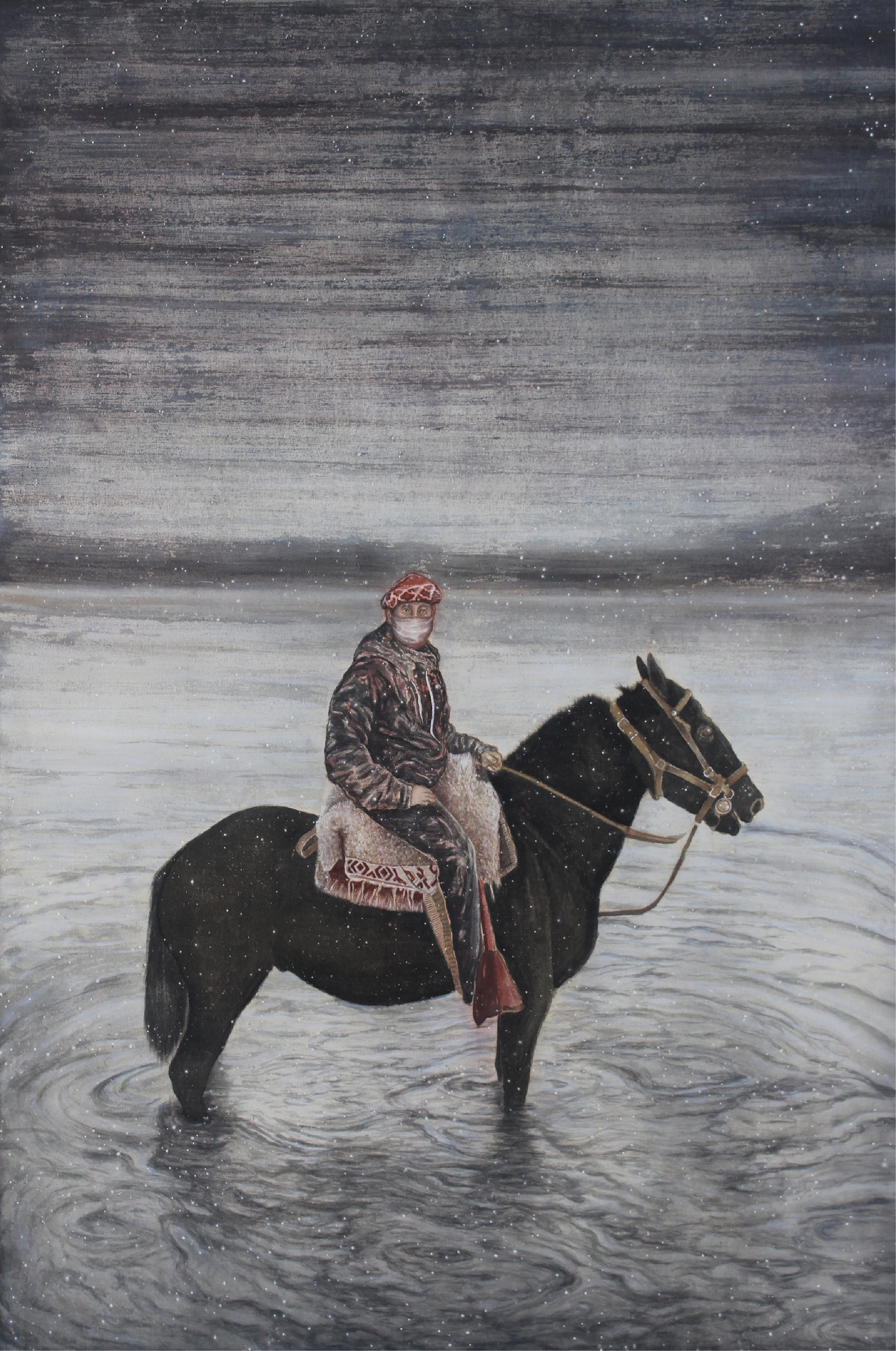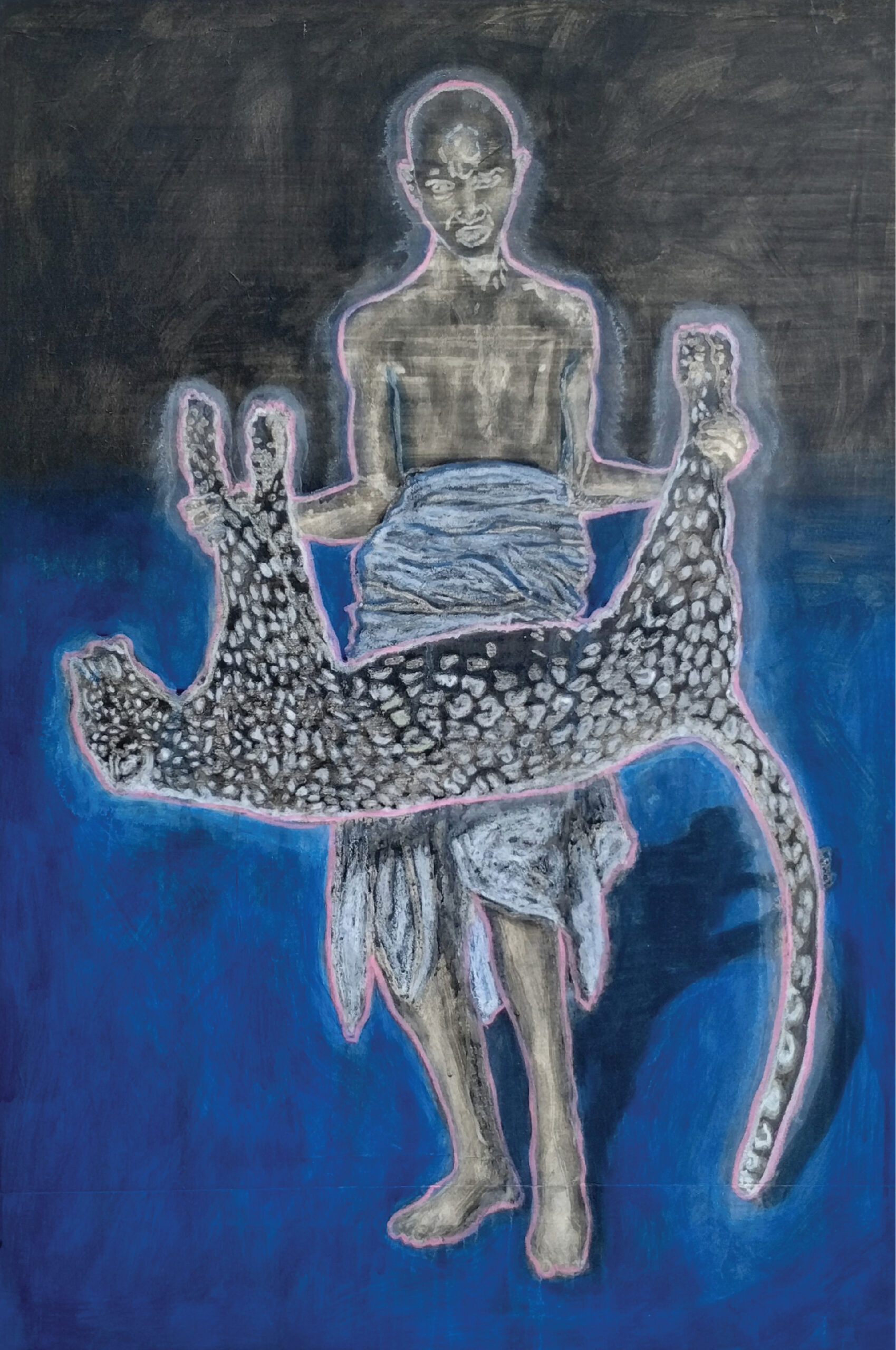 '“the arrival” acrylic, ink and oil pastel on canvas 72” x 48”'