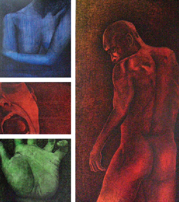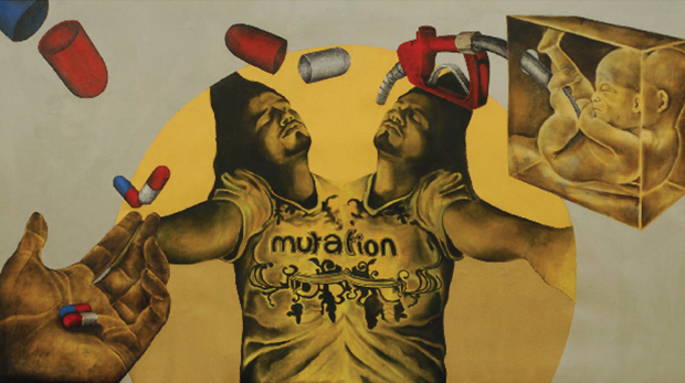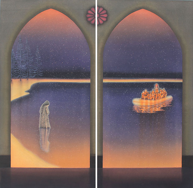 '“the resurrection” acrylic on plexiglass mounted on wooden lightbox with LED fixtures 74” x 50”'