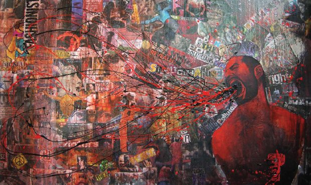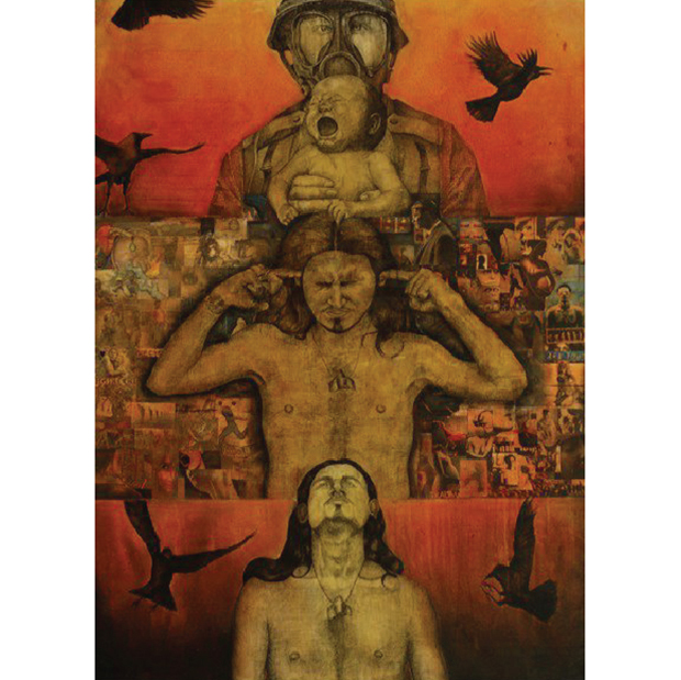 '“the resurrection” acrylic, ink and silicon carbide on canvas 90” x 54”'