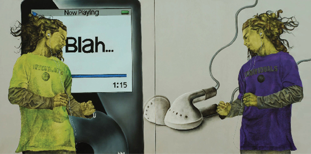 '“the triumph” acrylic and engraving on plexiglass mounted on wooden lightbox with LED fixtures 24″ x 24″'
