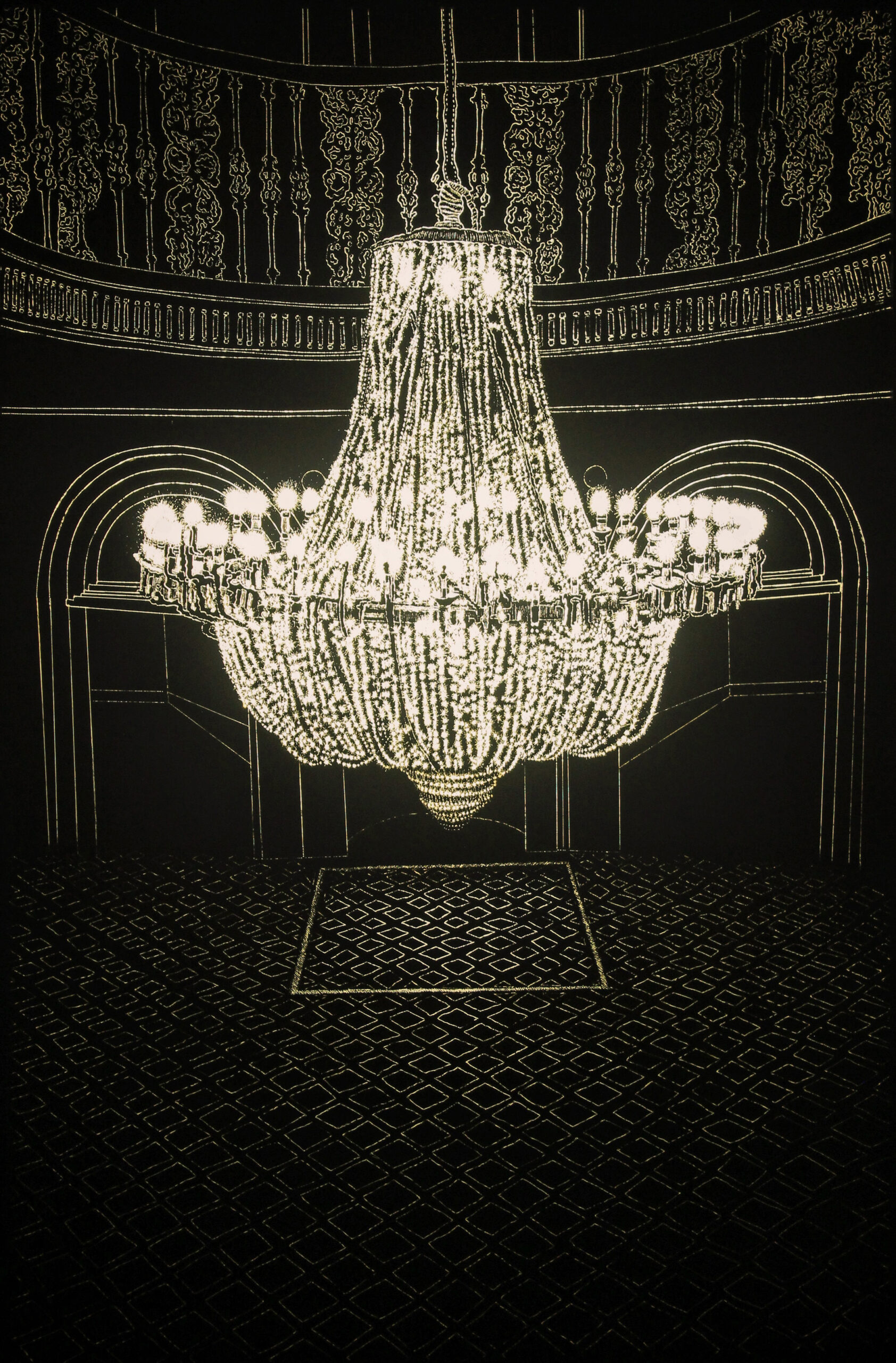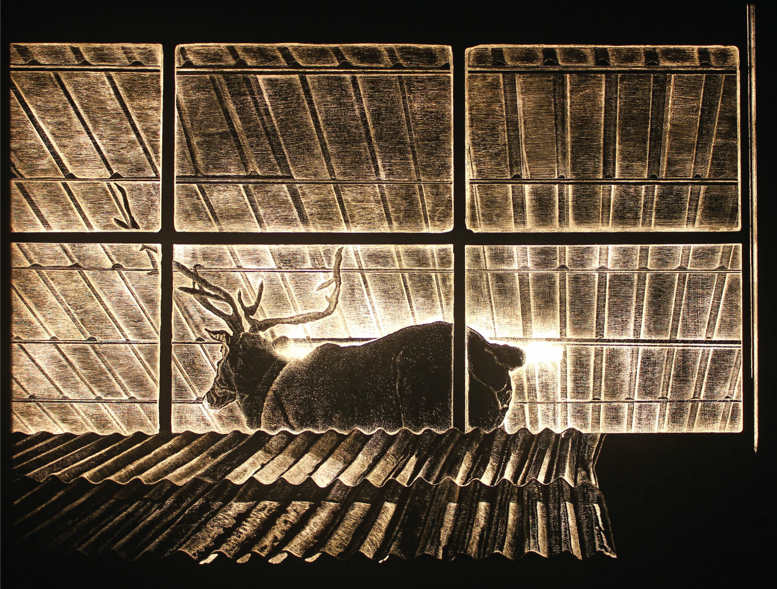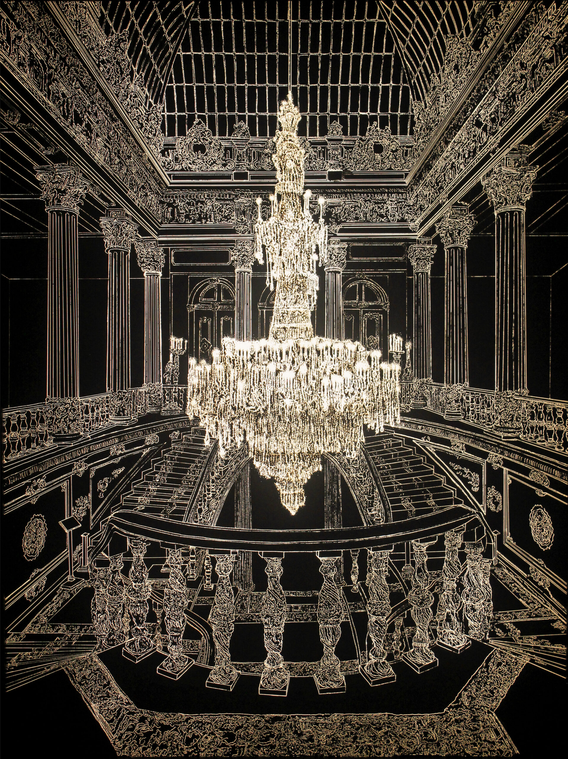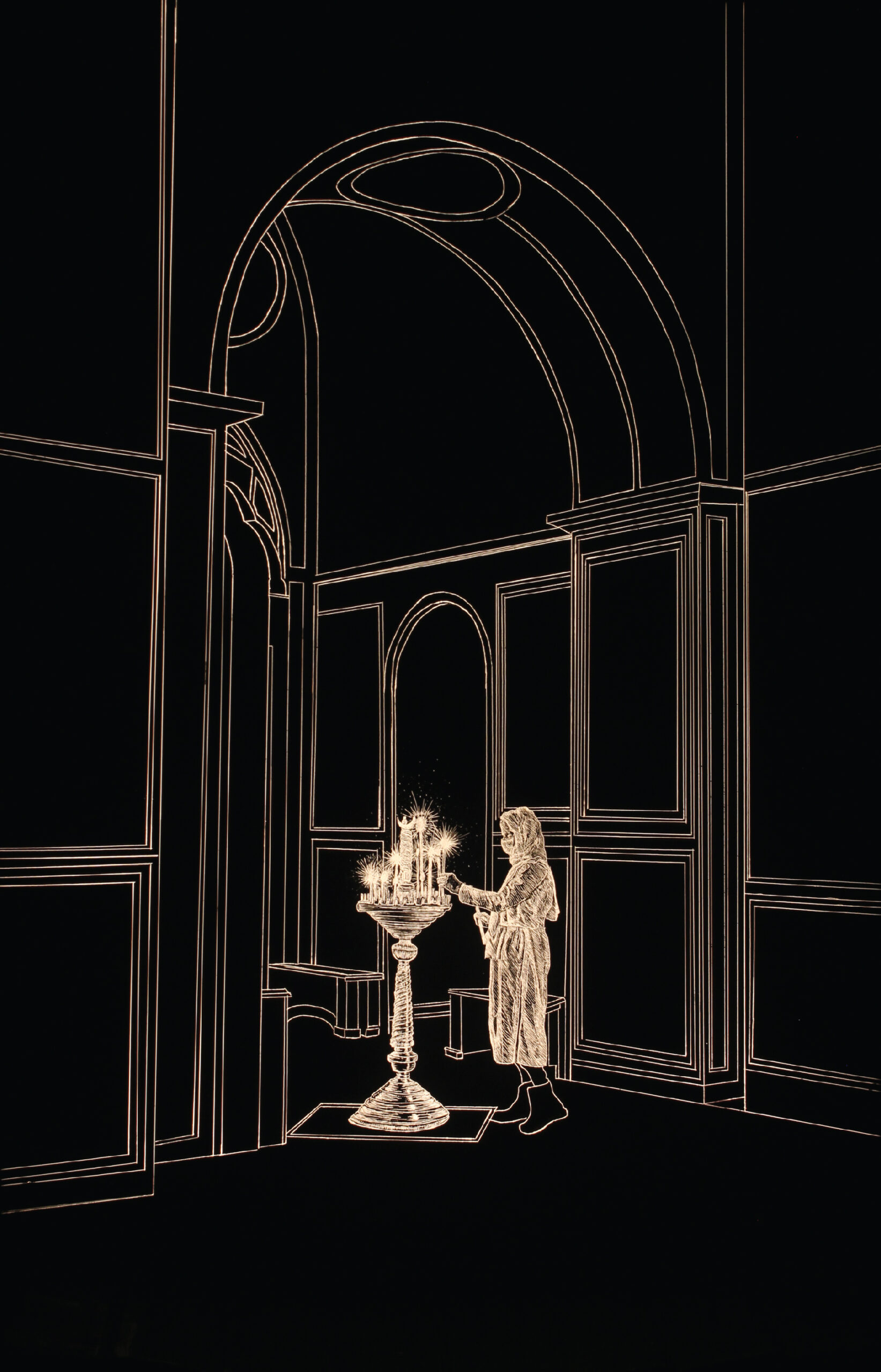 '“sanctum II” acrylic and engraving on plexiglass mounted on wooden lightbox with LED fixtures 48” x 36”'
