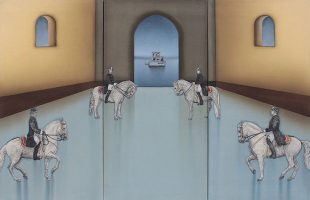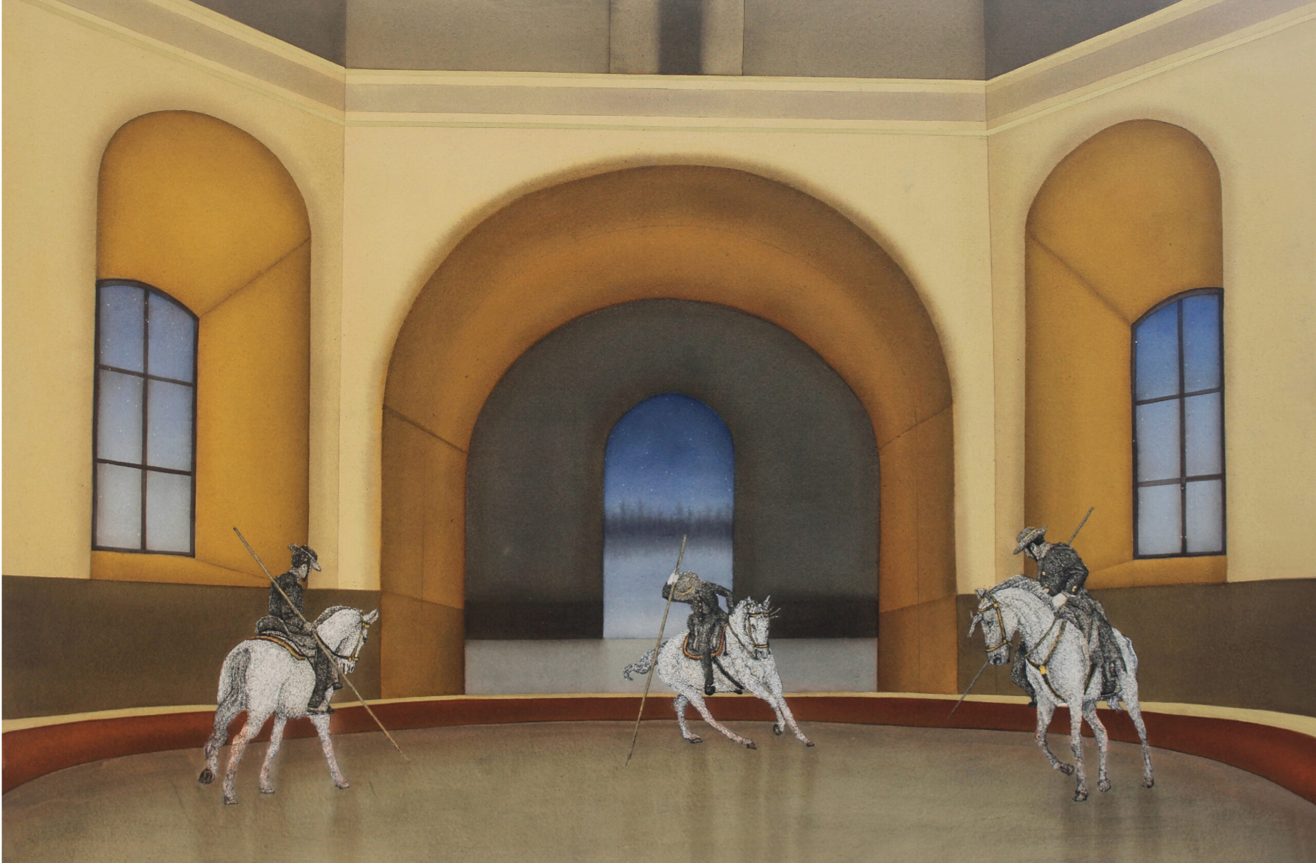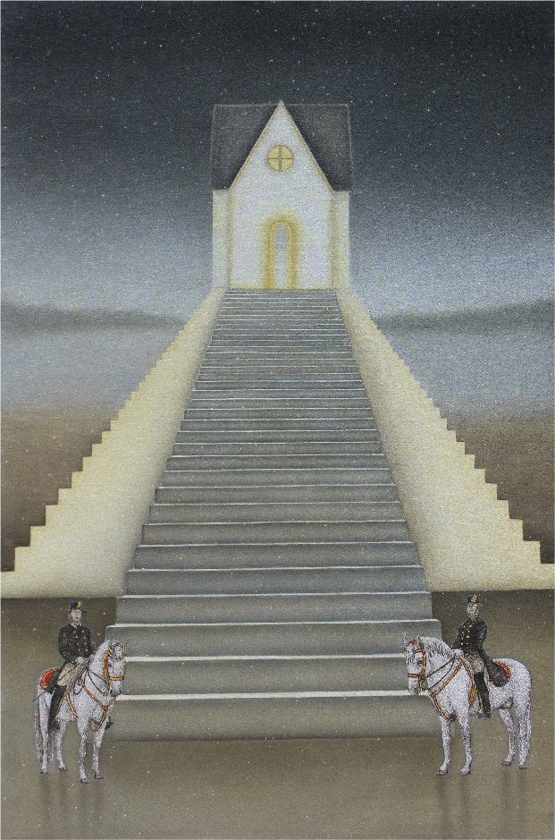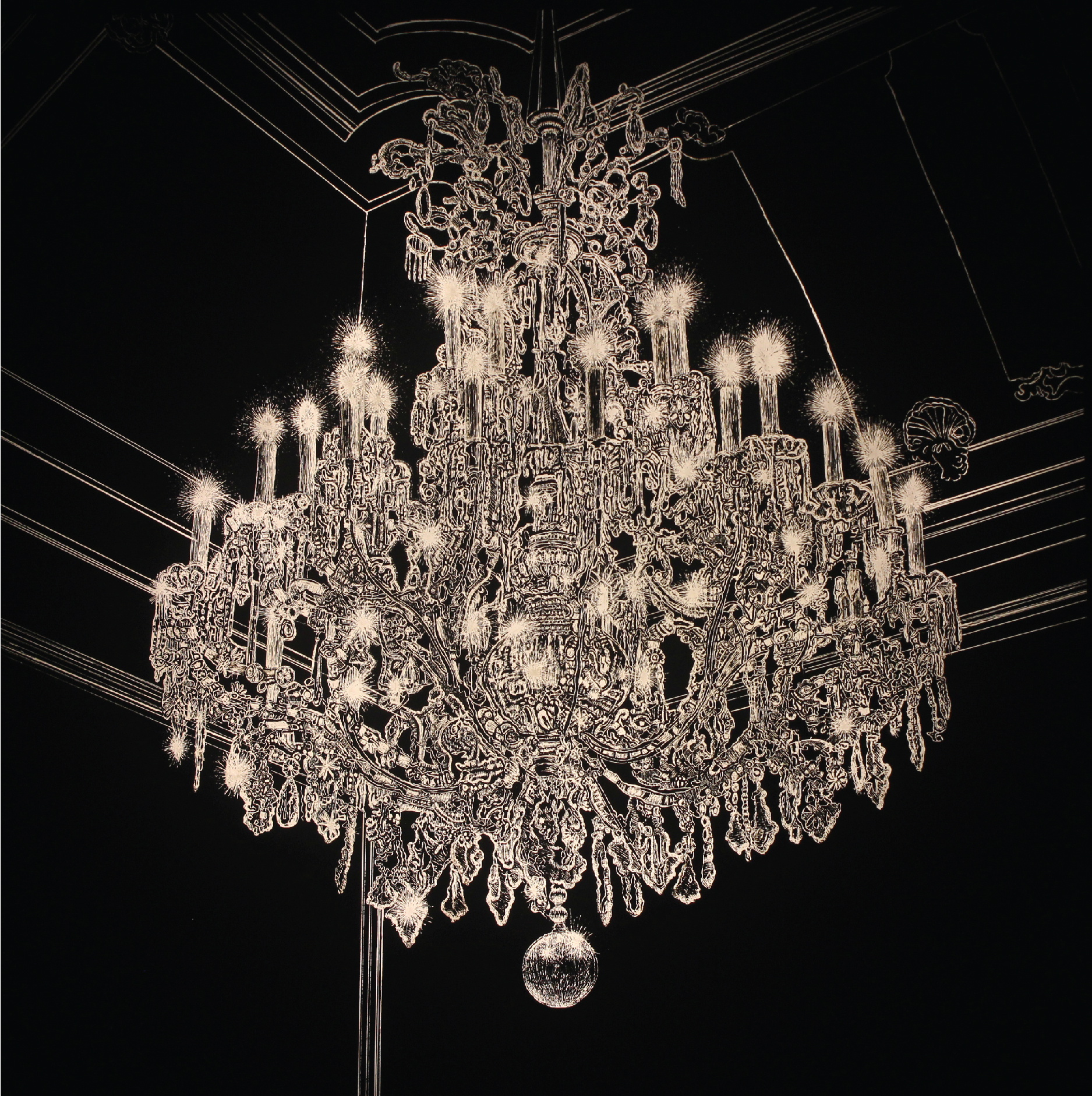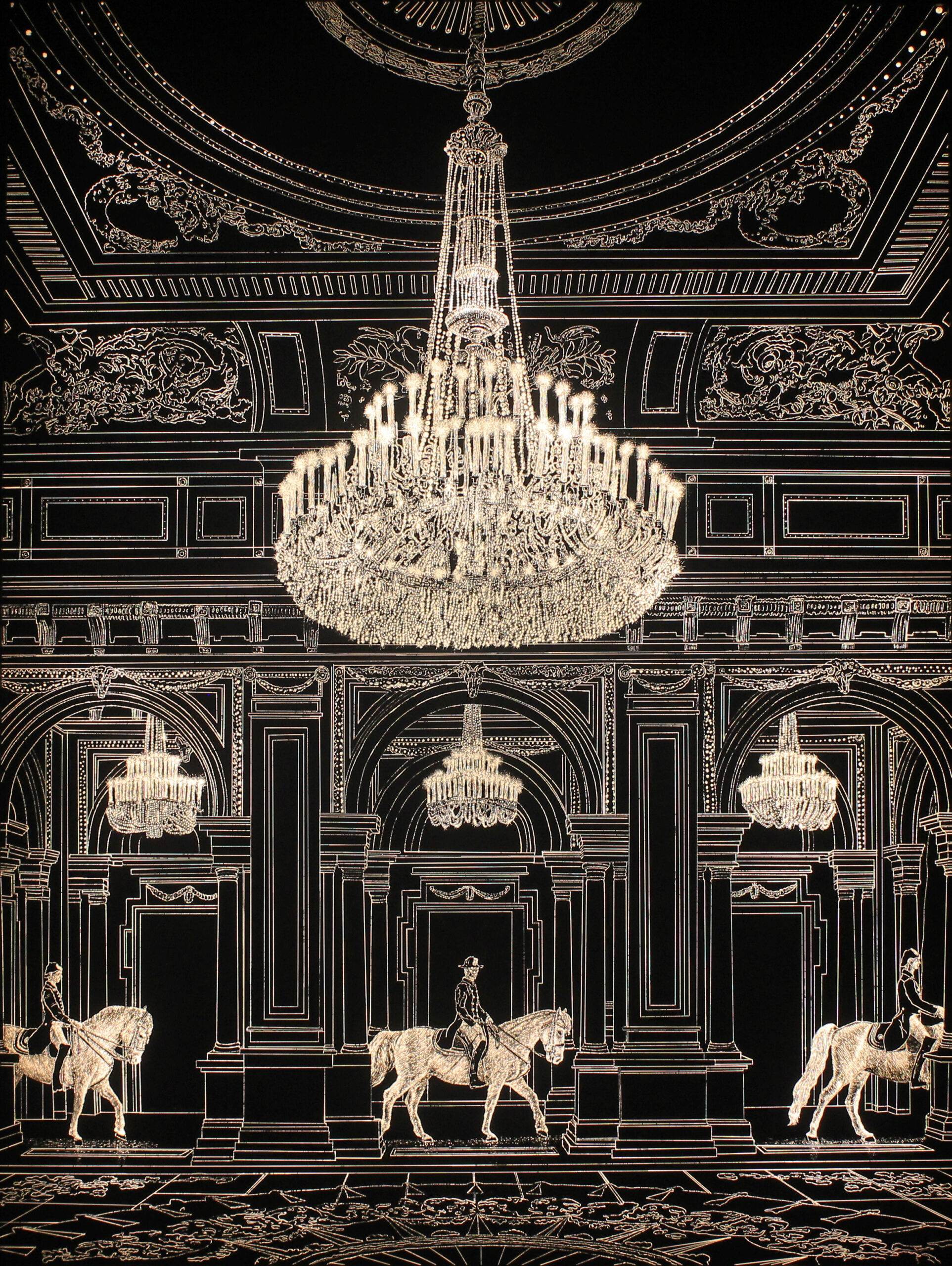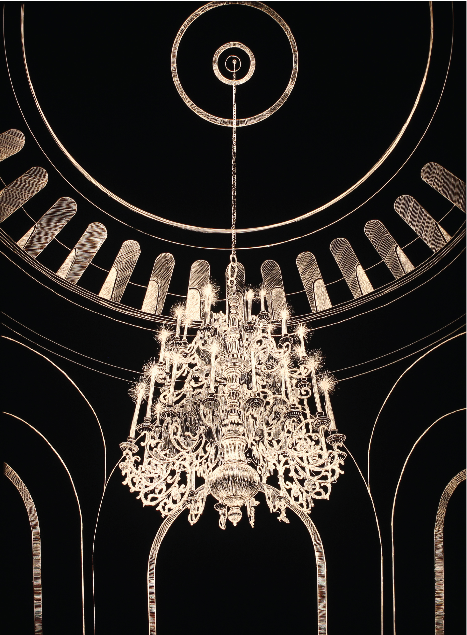 '“sanctum II” acrylic and engraving on plexiglass mounted on wooden lightbox with LED fixtures 48” x 36”'