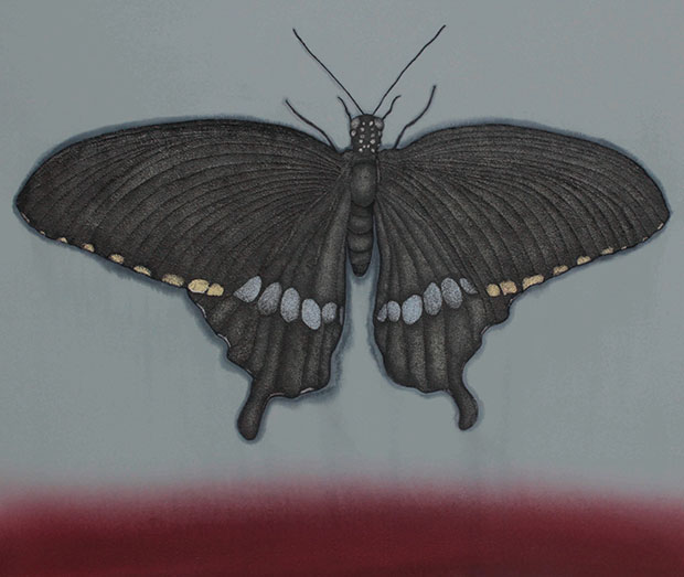 '“the monarch” acrylic, ink and silicon carbide on canvas 72” x 48”'