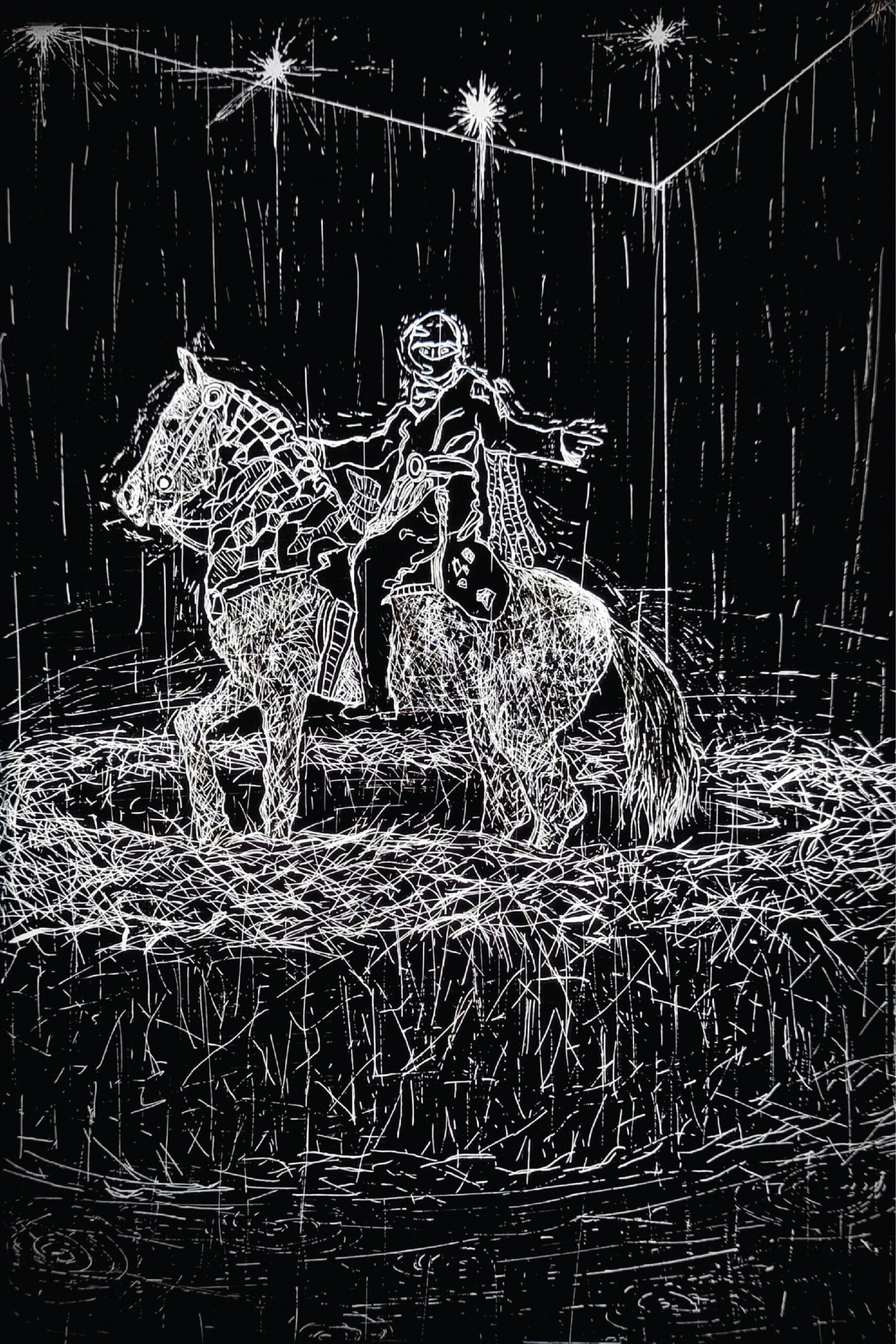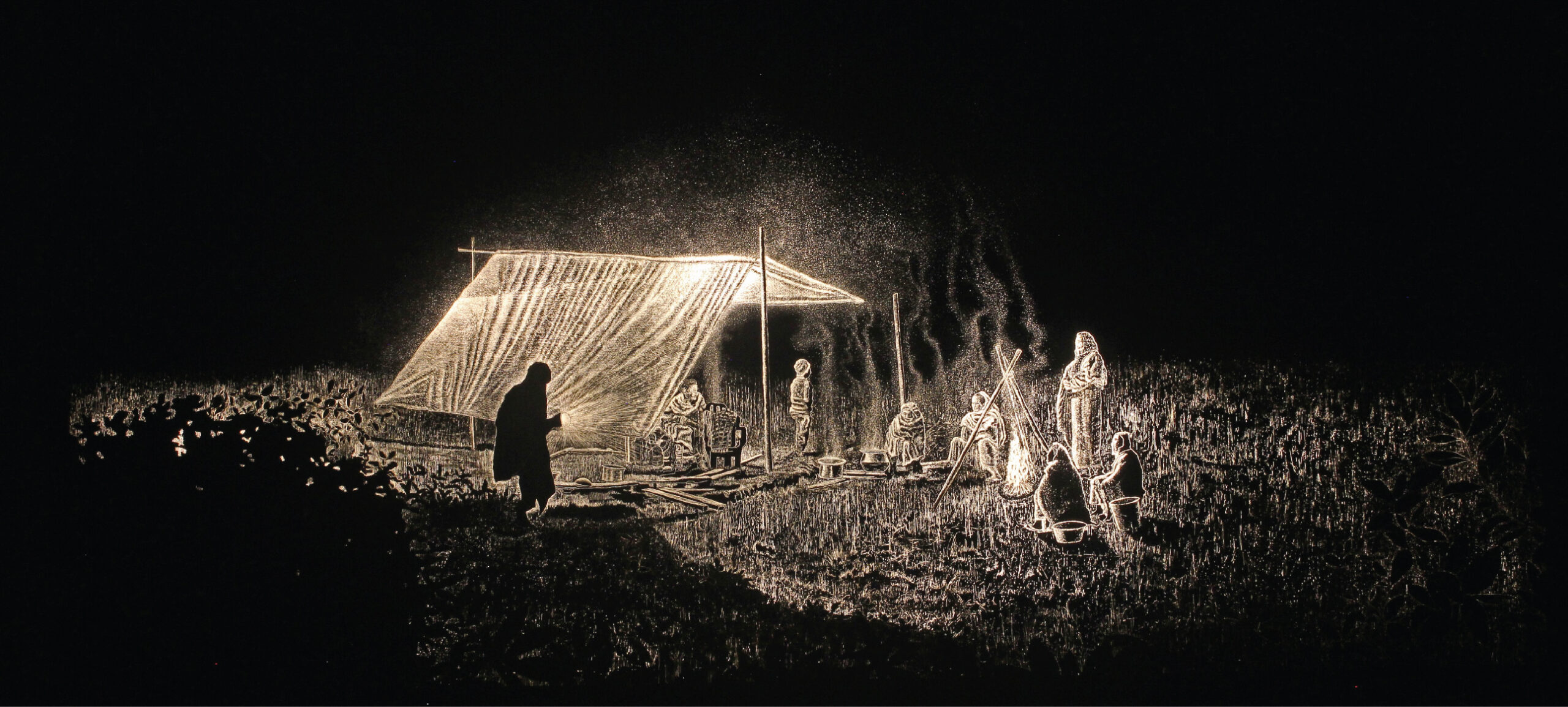 'on the darkest night, will there be light?” acrylic and engraving on plexiglass mounted on aluminium lightbox with led fixtures 48” x 36”'