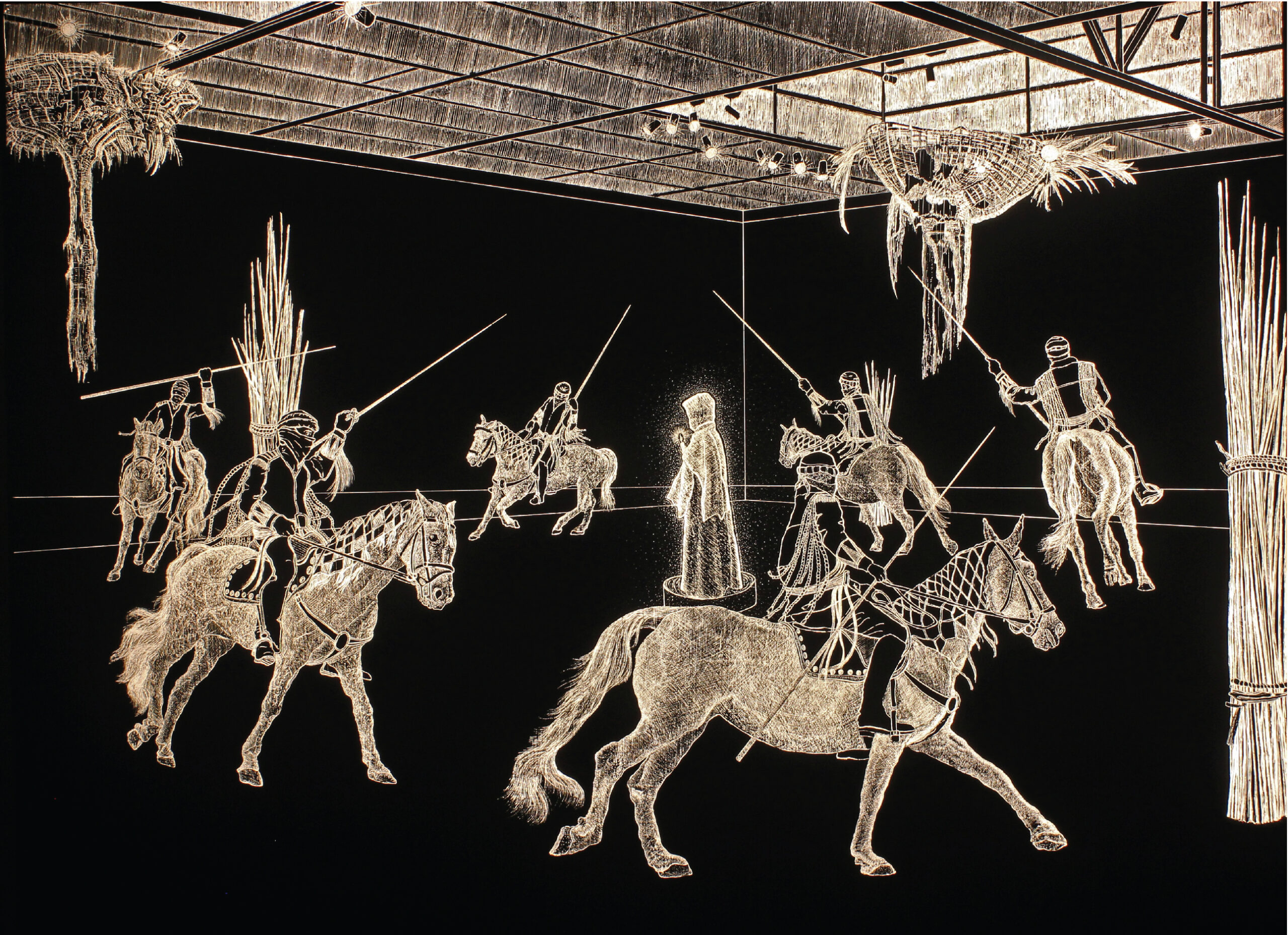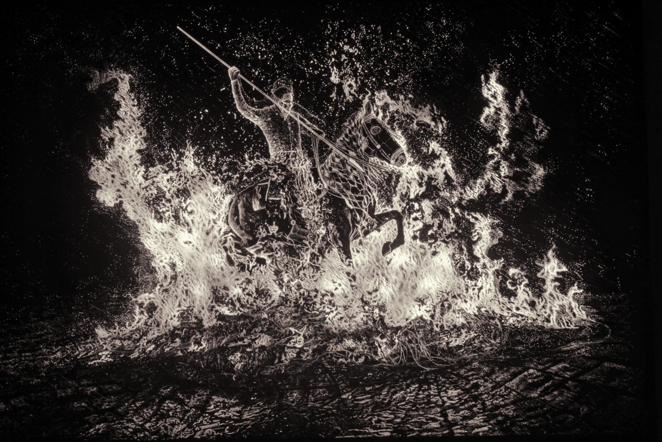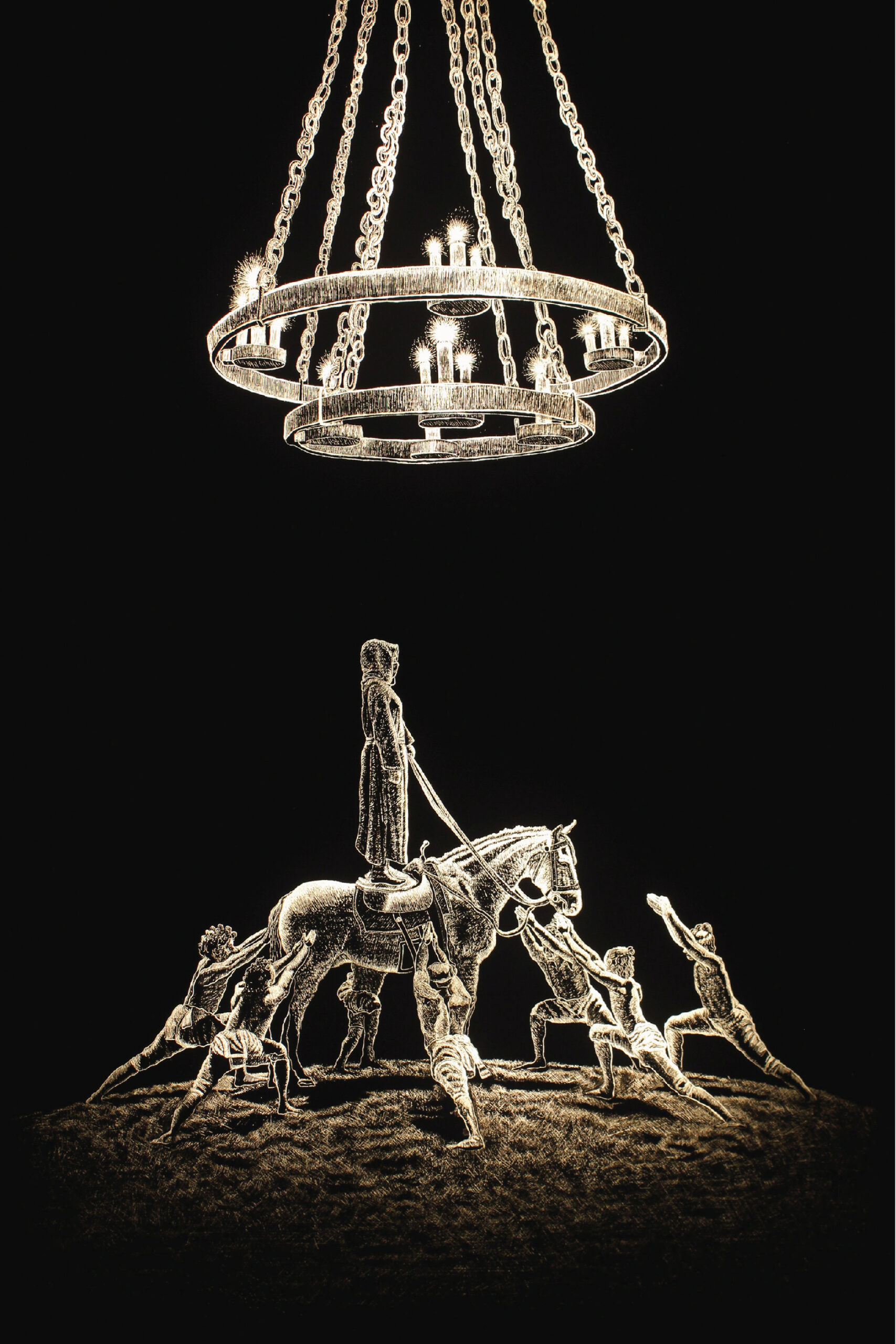 '“the triumph” acrylic and engraving on plexiglass mounted on wooden lightbox with led fixtures 48” x 36”'