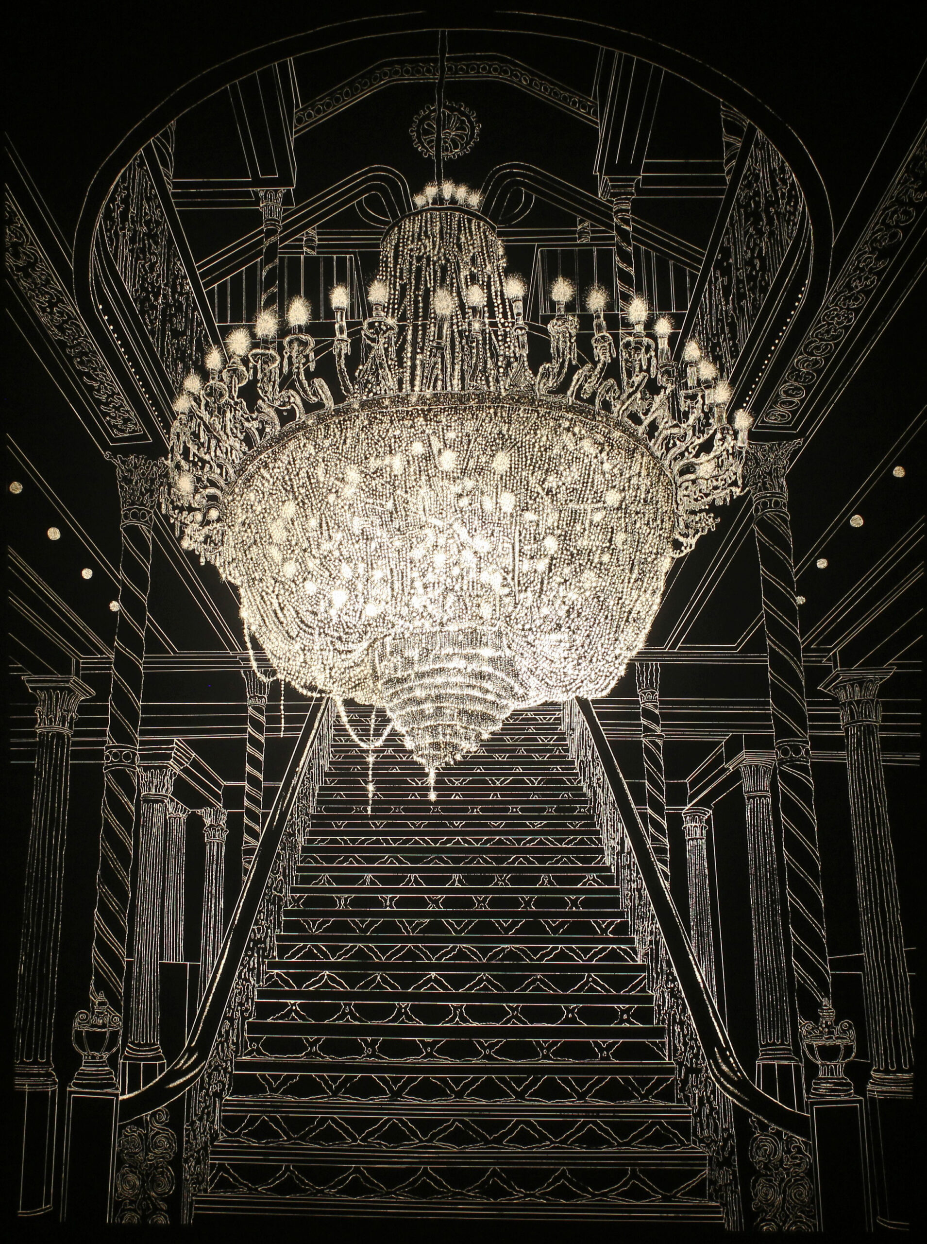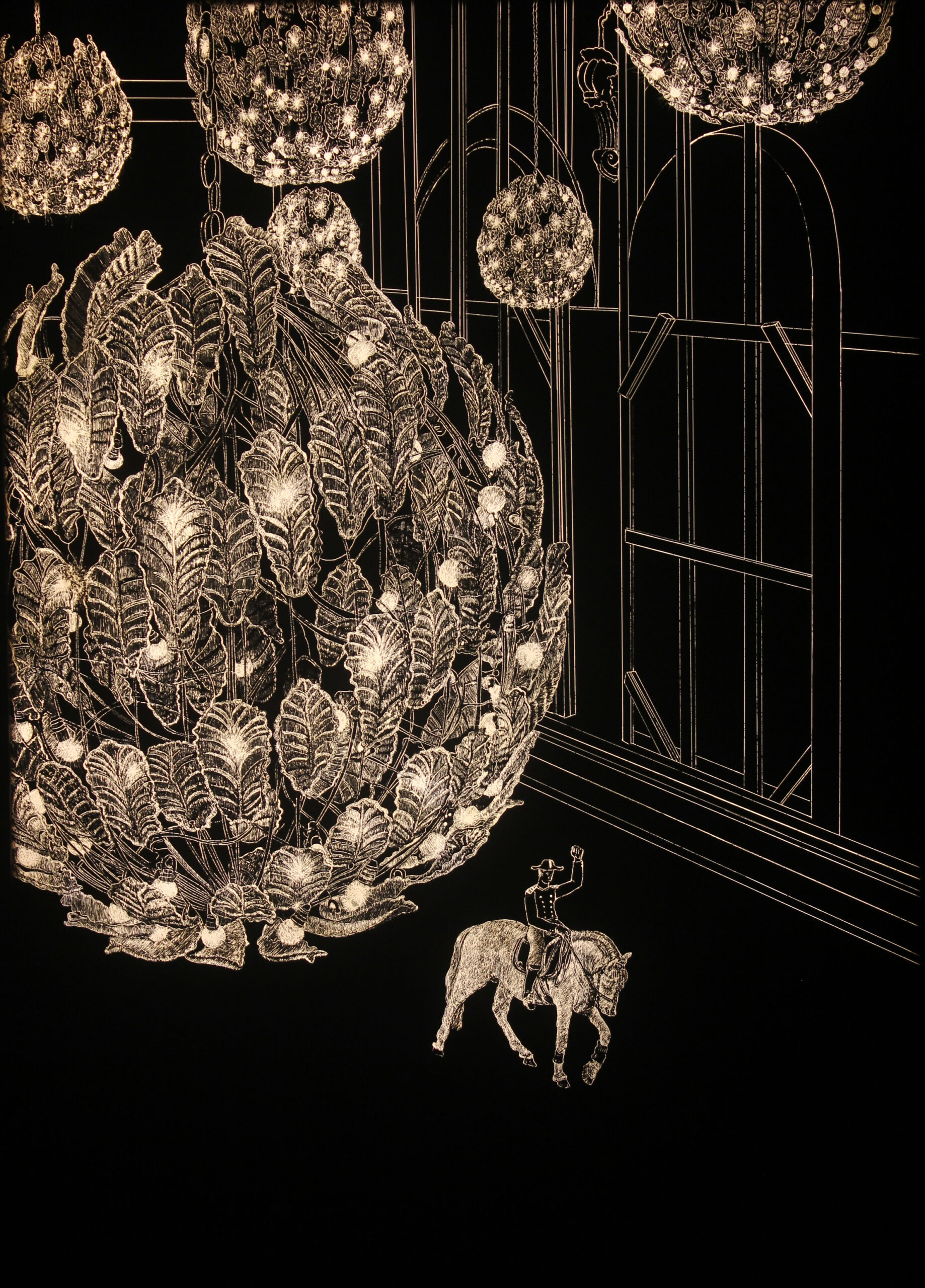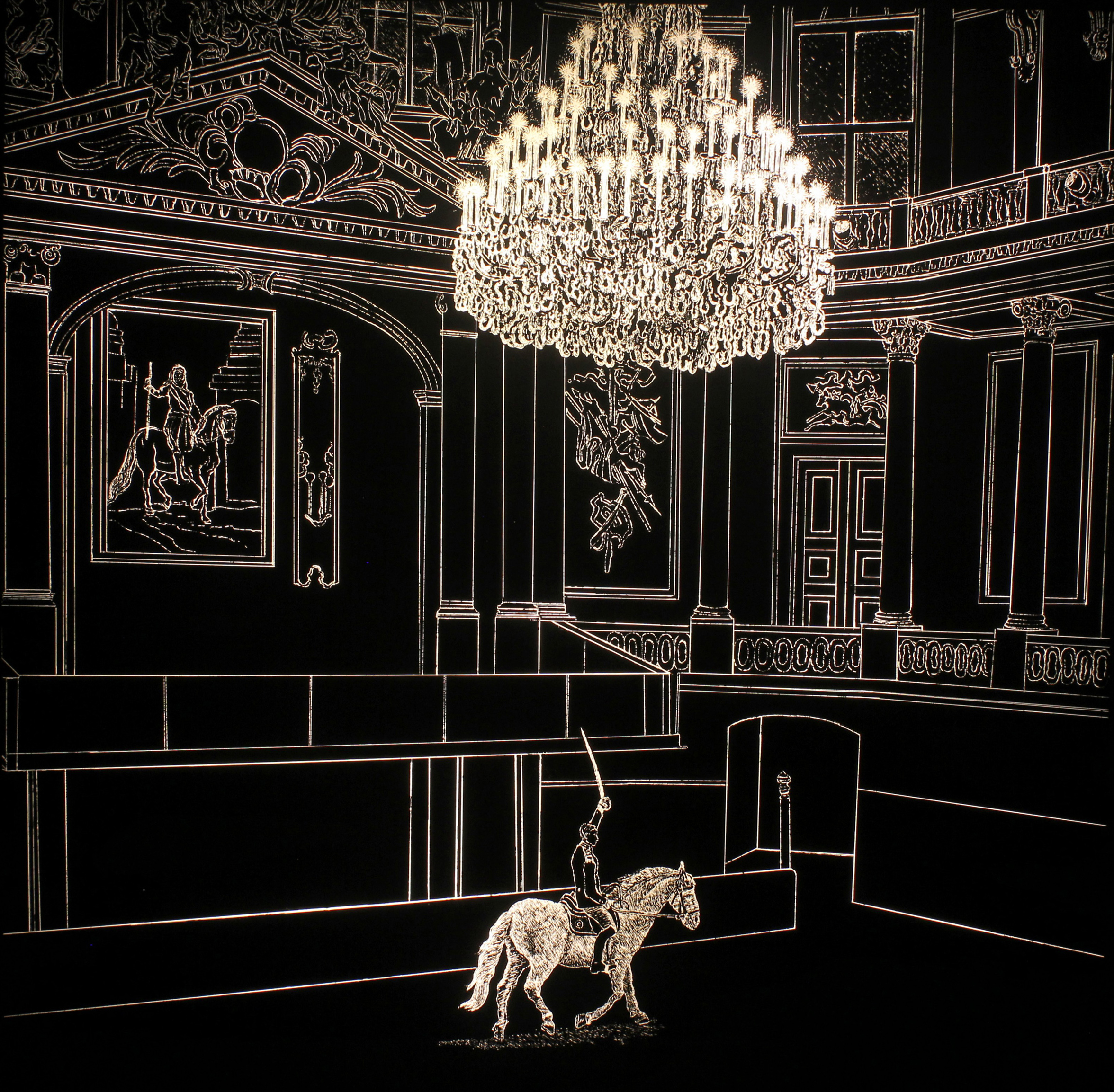'“an apparition” acrylic and engraving on plexiglass mounted on wooden lightbox with led fixtures 50” x 39”'