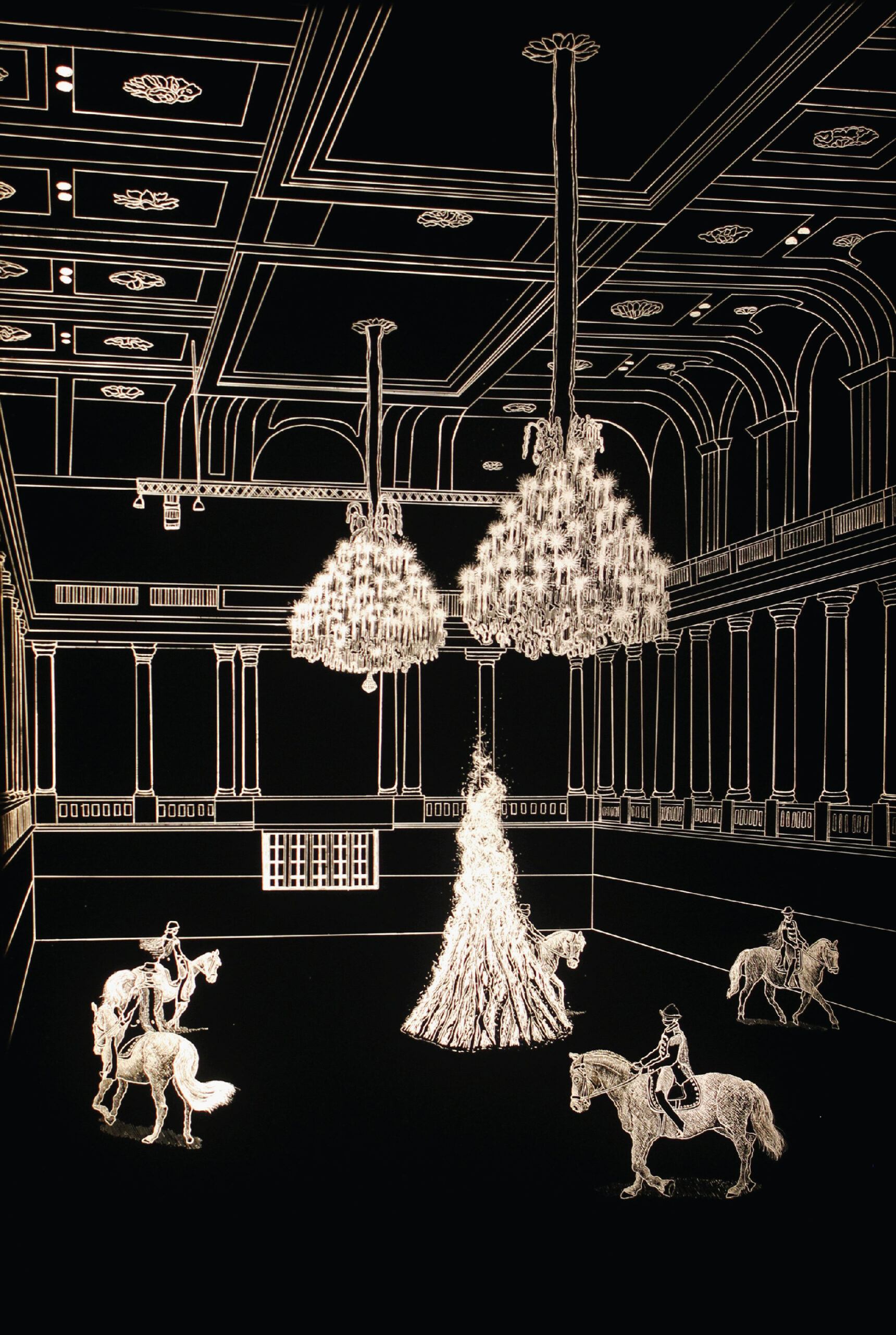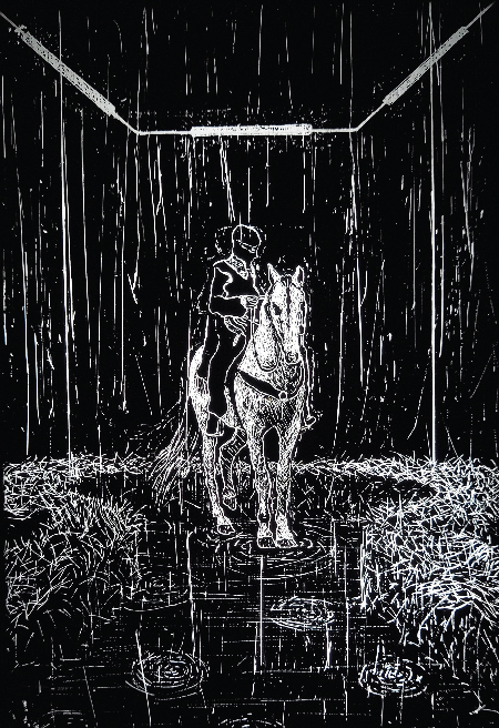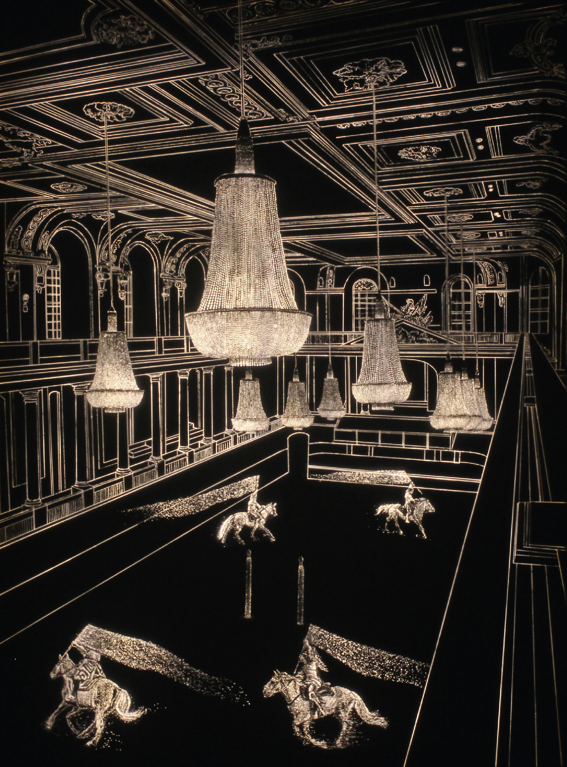 '“an apparition” acrylic and engraving on plexiglass mounted on wooden lightbox with led fixtures 50” x 39”'